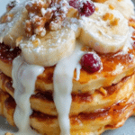 Banoffee pie pancakes combine the rich flavors of banoffee pie with the fluffy goodness of pancakes. This indulgent breakfast or dessert treat layers caramel-like dulce de leche, fresh bananas, and chocolate over light, airy pancakes. It’s a delicious twist that’s sure to impress.