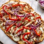 - Assemble the flatbread: Place the flatbreads on a baking sheet or pizza stone. Evenly spread the BBQ chicken mixture onto each flatbread, followed by the sliced red onions and sweet pepper if using. Sprinkle the shredded mozzarella cheese generously on top.