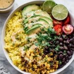 Keywords: black bean burrito bowl, vegetarian burrito bowl, chipotle sauce, Mexican rice bowl, healthy burrito bowl, easy vegetarian recipe