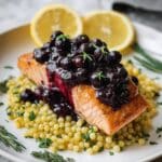 - Assemble and Serve: Spoon a generous amount of blueberry glaze over each salmon fillet. Serve the salmon alongside the lemon herb couscous, garnished with additional lemon zest or herbs as desired.