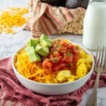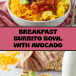 A quick and delicious Breakfast Burrito Bowl that combines fluffy scrambled eggs, creamy avocado, melted cheddar, and fresh salsa for a flavorful and satisfying morning meal without the tortilla.