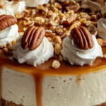 - Apply sauce and garnish: Pour the cooled caramel sauce evenly over the chilled cheesecake. Top with whipped cream and garnish with pecan halves for an elegant finish.