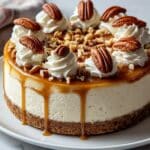 This Browned Butter Pecan Cheesecake combines a rich, creamy cream cheese filling with a buttery pecan graham cracker crust, topped with a luscious browned butter caramel sauce. Finished with whipped cream and pecan halves, this decadent dessert is perfect for special occasions or an indulgent treat.