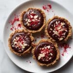 Four small round tarts sit on a white plate, each with a crumbly golden brown crust forming the bottom and edges. The second layer is a smooth, dark chocolate filling that fills the crust almost to the top. The top layer is a mix of white almond slivers scattered over the chocolate along with bright red powder sprinkled unevenly, adding texture and color contrast. Some red powder is also scattered on the white plate around the tarts. The plate rests on a white marbled surface. photo taken with an iphone --ar 4:5 --v 7