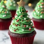 These Christmas Tree Cupcakes are festive, delicious, and perfect for holiday celebrations. Moist chocolate cupcakes topped with creamy green frosting and decorated to look like mini Christmas trees will delight family and friends of all ages.