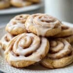 A close-up of a pile of soft cinnamon roll cookies on a white round plate with a simple raised edge pattern, each cookie showing a clear spiral of dough with cinnamon filling inside, topped with a smooth white glaze that drips lightly over the edges. The cookies have a light golden-brown color, with the glaze adding a shiny texture on top. The background is a soft focus white marbled surface with a blurred white cup in the distance. Photo taken with an iphone --ar 4:5 --v 7