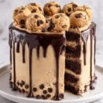 Keywords: cookie dough cake, chocolate chip cake, cookie dough filling, buttercream frosting, chocolate ganache dessert