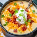 - Serve and Garnish: Pour the soup into bowls and top with your favorite loaded baked potato toppings such as bacon bits, scallions, sour cream, or extra cheese. Enjoy warm.