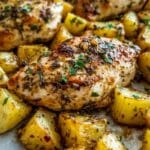 5. Step 5: Garnish with freshly chopped parsley before serving. Enjoy your flavorful, cheesy garlic chicken and potatoes!