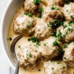 Store leftover meatballs and sauce in an airtight container in the refrigerator for up to 3 days. Reheat gently on the stove or in the microwave, adding a splash of beef broth or cream if the sauce thickens too much.