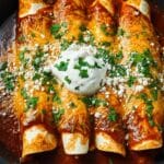 These delicious chicken enchiladas feature tender shredded chicken wrapped in soft flour tortillas, smothered in zesty red enchilada sauce, and topped with melted Monterey Jack cheese for a creamy, flavorful dish perfect for family dinners or entertaining guests.