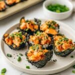 This Easy Baked Salmon Sushi Cups recipe combines the delicate flavors of sushi with a convenient baked preparation, creating a delicious and unique appetizer or main dish. Cubed salmon is marinated and baked inside crispy nori-lined cups filled with seasoned sushi rice, topped with a spicy mayo and garnished with furikake and green onions for a perfect bite-sized treat.