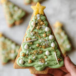 12. Add Festive Decorations: Decorate the frosted Christmas tree cookies with sprinkles, edible sparkling gold or silver dust or glitter, and place a small star decoration at the top of each cookie tree.