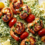 Grilled Lemon Shrimp with Pesto Couscous is a vibrant and fresh dish perfect for warm evenings. Juicy shrimp marinated in lemon and garlic are grilled to perfection and paired with a flavorful basil pesto couscous. This recipe is simple, quick, and bursting with bright flavors.