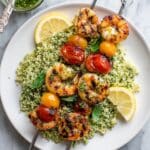 This Grilled Lemon Shrimp with Pesto Couscous recipe combines juicy, marinated shrimp grilled to perfection and served over fluffy couscous tossed with a vibrant homemade basil pesto. The dish is brightened with fresh lemon zest and garlic, featuring a perfect balance of spice and tang, complemented by cherry tomatoes and fresh basil for a fresh, summery meal that’s quick and easy to prepare.