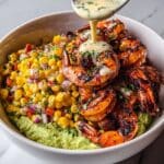 - Assemble the Bowl: In serving bowls, arrange the grilled shrimp alongside the corn salsa and slices of ripe avocado. Drizzle the creamy garlic sauce over the top or serve it on the side for dipping.