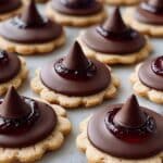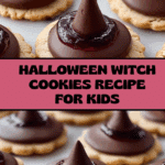 Keywords: Halloween cookies, witch cookies, fudge striped cookies, Hershey’s Kisses, no-bake Halloween treats, festive cookies