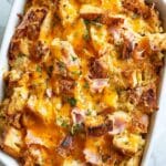 Keywords: Ham and cheese casserole, croissant breakfast bake, breakfast casserole, baked egg dish, brunch recipe, cheesy ham casserole