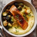 This Maple Cider Glazed Salmon with Honey Butter Polenta is a delectable dish that combines tender salmon filets glazed in a sweet and tangy maple cider sauce, paired with creamy, honey-infused butter polenta and roasted Brussels sprouts. The glaze features apple cider, maple syrup, soy sauce, and a hint of bourbon and cayenne pepper for a subtle kick. Served alongside roasted honeycrisp apples and Brussels sprouts, this meal offers a harmonious balance of flavors and textures perfect for a comforting yet elegant dinner.