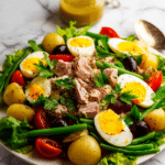 Nicoise Salad is a classic French dish featuring tender baby potatoes, crisp green beans, ripe tomatoes, fresh romaine lettuce, hard-boiled eggs, black olives, and chunks of tuna, all brought together with a zesty lemon Dijon dressing. This vibrant salad combines fresh, wholesome ingredients to create a satisfying and flavorful meal that’s perfect for lunch or a light dinner.