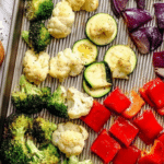 Keywords: oven roasted vegetables, roasted broccoli, roasted cauliflower, healthy vegetable side, easy vegetable recipe, roasted zucchini, roasted bell peppers, roasted red onion