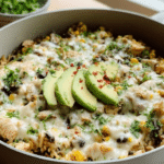 Salsa Verde Chicken & Rice Skillet is a flavorful one-pan meal combining tender shredded rotisserie chicken with zesty salsa verde, black beans, roasted corn, and aromatic spices, all cooked with rice in a savory broth. Topped with melted Monterey Jack cheese and fresh cilantro, this hearty and comforting dish is easy to prepare, perfect for a weeknight dinner that satisfies with bold Mexican-inspired flavors.