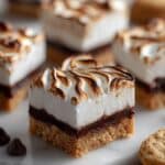 These decadent S’mores Brownies combine a crunchy digestive cookie crust, rich chocolate brownie layer, and a fluffy toasted meringue topping. Perfectly balancing crispness, fudginess, and light sweetness, this dessert is a delightful twist on classic s’mores, baked in the oven and finished with a caramelized meringue top.