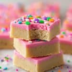 A close-up of a stack of three square-shaped blondies on a white marbled surface, each blondie has a thick light golden-brown base layer with a smooth, thick pink frosting layer on top, scattered with colorful round confetti sprinkles in green, orange, purple, white, yellow, and pink. The top blondie has a bite taken out from one corner, showing the soft texture inside. In the blurred background, more pink-frosted blondies with sprinkles are visible. photo taken with an iphone --ar 4:5 --v 7