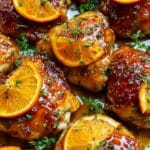 This Sweet and Savory Roasted Orange Chicken features tender, juicy chicken thighs roasted with fresh orange slices, fragrant garlic, and a honey-soy glaze that perfectly balances sweet and savory flavors. The dish is brightened with fresh thyme and paprika, making it a delicious and elegant meal perfect for weeknight dinners or special occasions.