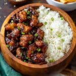 A wooden bowl filled with two layers: the bottom layer is white steamed rice with a soft, fluffy texture, and the top layer is crispy chicken pieces coated in a shiny, dark brown glaze that looks sticky and sweet. The chicken is sprinkled with small green onion pieces for color. The bowl sits on a white marbled surface, with a teal cloth partially visible nearby and some scattered green onion pieces. In the background, there is a white bowl with a mix of black and white sesame seeds and to the side, some golden fries can be seen slightly out of focus. Photo taken with an iphone --ar 4:5 --v 7