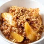 3. Assemble the Crisp: Spread the apple mixture evenly in a greased 8×8-inch baking dish. Sprinkle the oat topping evenly over the apples, covering them completely.